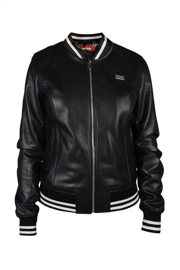 Philipp Plein leren bomberjack met ritssluiting.Zwarte elastische banden met witte banden in de taille, manchetten en kraag.Rode binnenkant met hartjes en rozen.PP logoplaat aan de voorkant.Wit logo aan de achterkant.Zakken aan de voorkant.100% leer.Gemaakt in Italië.