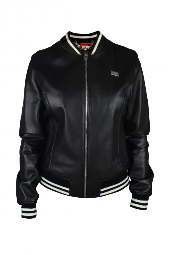 Philipp Plein leren bomberjack met ritssluiting.Zwarte elastische banden met witte banden in de taille, manchetten en kraag.Rode binnenkant met hartjes en rozen.PP-logoplaatje aan de voorkant.Grijs logo op de achterkant.Zakken aan de voorkant.100% leer.Gemaakt in Italië.