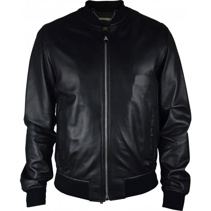 Philipp Plein zwart leren bomberjack met ritssluiting.Zwart elastiek in de taille en bij de manchetten.Indiase schedelillustratie en logo op de achterkant.Made in Italy.