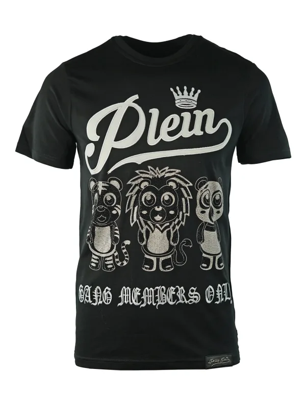 Zwart T-shirt met ronde hals en strassdetails "Plein" op de voorkant over de borst Diamante tijger, leeuw en panda op de voorkant Diamante "Gang Members Only" geschreven op de voorkant