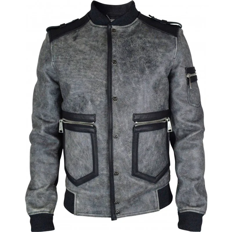 Philipp Plein jasje van verouderd grijs leer.Zwarte leren details op de mouwen, zakken en schouders.PP logo knoopdetails.Zwart elastiek in de taille en mouwen.Gemaakt in Italië.