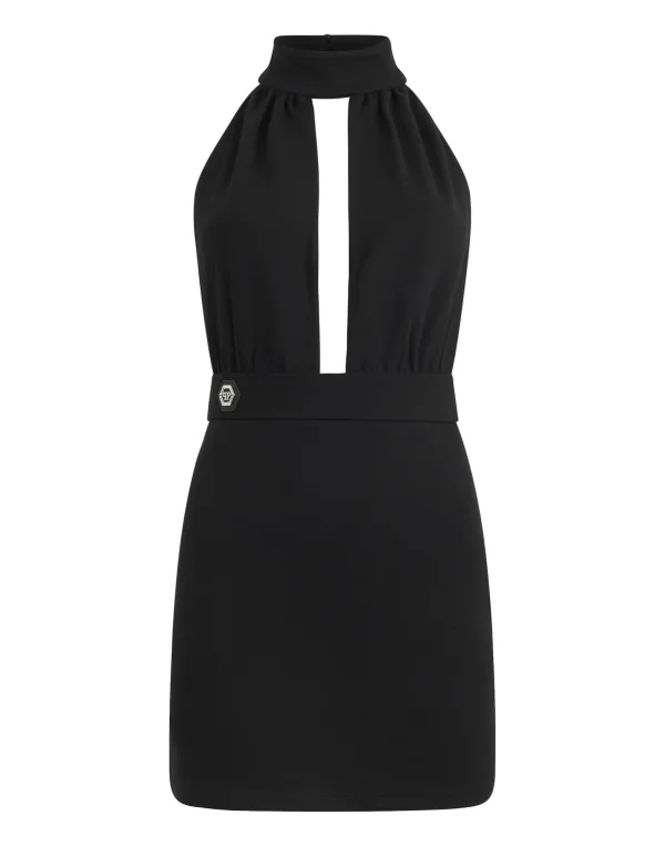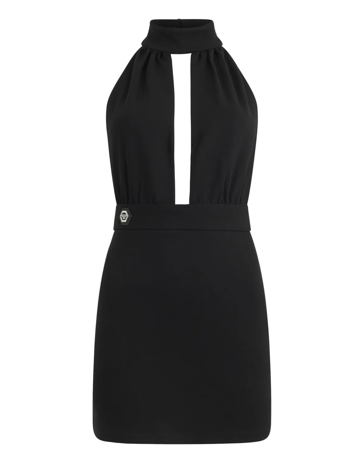 Design: Diepe snit/decolleté, Ritszakken aan de zijkant, Knop sluiting; Type sluiting: Ritssluiting; Materiaal: Jersey; Halstype: Opstaande kraag; Motief: Tekst print; Soort bandjes: Haltermodel; Details: Cut-outs, Gedrapeerd, Backless; Extra's: Label plaatje, Op staal naden; Lengte: Kort/mini; Snit: Figuur omarmend; Pasvorm: Aansluitende pasvorm; Armlengte: Mouwloos