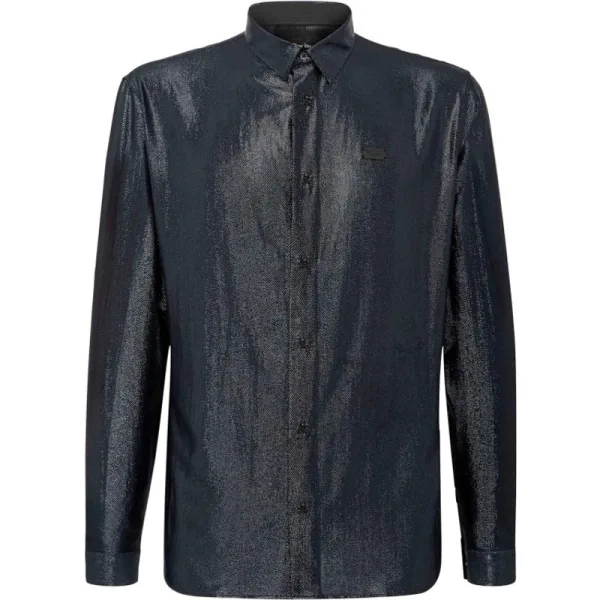 LS Skull Philipp Plein glanzend zwart geweven katoenen overhemd.Metalen merkbadge op de voorkant.Knopen versierd met kleine schedelvormige studs.Gemaakt in Italië.