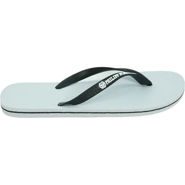 Philipp Plein merklogo witte teenslippers. Philipp Plein Flips Flops. Philipp Plein-branding. 100% EVA-zool, 100% PL-bovenwerk. Philipp Plein 2022 strandkledinglijn. Stijlcode: IMPS904 01B