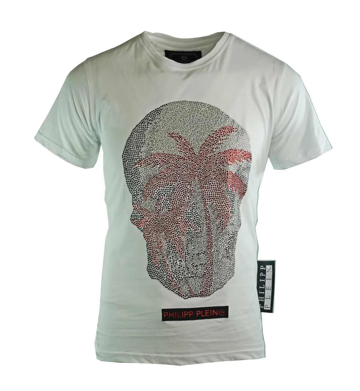 Philipp Plein MTK3070 01 T-shirt. Philipp Plein wit T-shirt. 100% katoen. Schedelmotief op de voorkant. Diamante detaillering. Ronde kraag