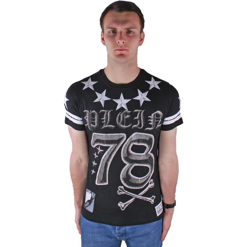 Philipp Plein Orides MTK0330 02 T-shirt. Zwart grafisch T-shirt met ronde hals. "PLEIN" op voorzijde met "78" eronder. Sterpatroon rond de nek. 100% katoen. "Skull And Bones" Boven Schedel Op Rug