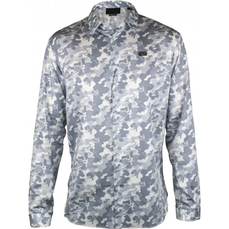 Philipp Plein overhemd van grijs katoen en elastaan.Militaire print.Zilveren metalen logoplaatje.Parelmoeren knopen.Gemaakt in Italië.