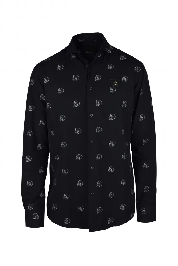 Zwart gestreept katoenen overhemd van Philipp Plein.Overal witte schedelprints.Zwart leren patch op de borst met zilveren metalen doodshoofd.Zwarte parelmoeren knopen.100% katoen.Gemaakt in Italië.