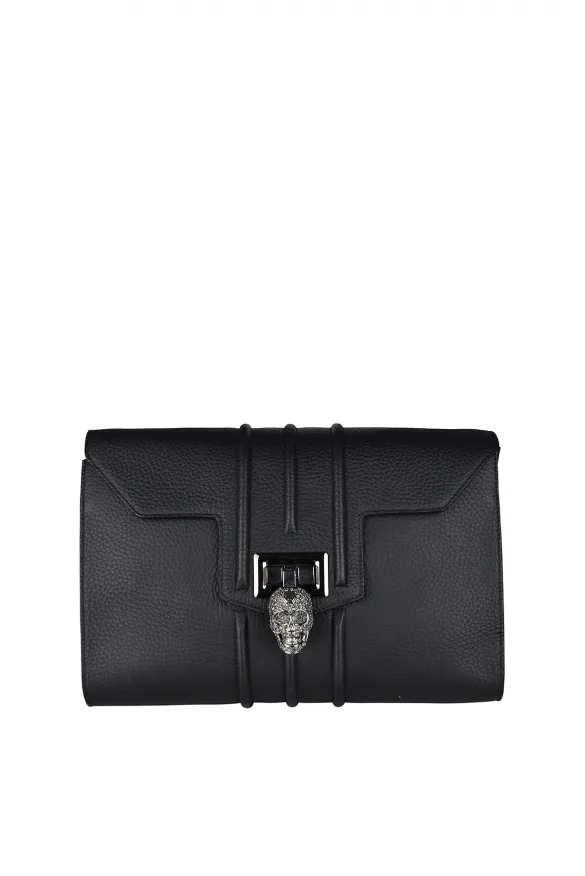 Philipp Plein schoudertas van zwart leer.Klepsluiting.Sluiting met strass-doodshoofd en gekruiste beenderen.Zilveren metalen logopatch op de achterkant.Afneembare, verstelbare schouderband.Binnenzak met ritssluiting. Afmetingen: lengte 29,5 cm x hoogte 20 cm x diepte 7 cm.Gemaakt in Italië.
