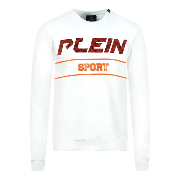 Philipp Plein Sport oranje vet logo witte trui. Philipp Plein Sport witte trui. 51% katoen 49% polyester, lange mouwen, ronde hals. Grote Plein-branding op de voorkant. Badges met Plein-merk, elastische taille en mouwuiteinden. Stijlcode: FIPS211 01