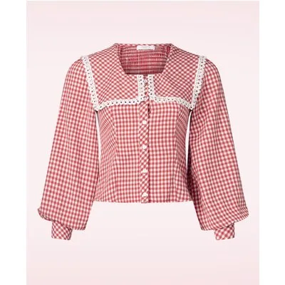 “Pretty in puff and plaid.” Deze licht getailleerde top in blouse stijl heeft lange pofmouwen, een opvallende, oversized kraag met kanten bies en een knoopluiting aan de voorzijde. Uitgevoerd in een luchtige 100% viscose met een hele lichte stretch en de iconische gingham print in rood en wit. * Licht getailleerd * Elastisch smokwerk aan de achterzijde * Oversized kraag met kanten bies * Lange pofmouwen met manchetten * Reeks knopen * Lang genoeg om op een mid-waist broek of rok te dragen