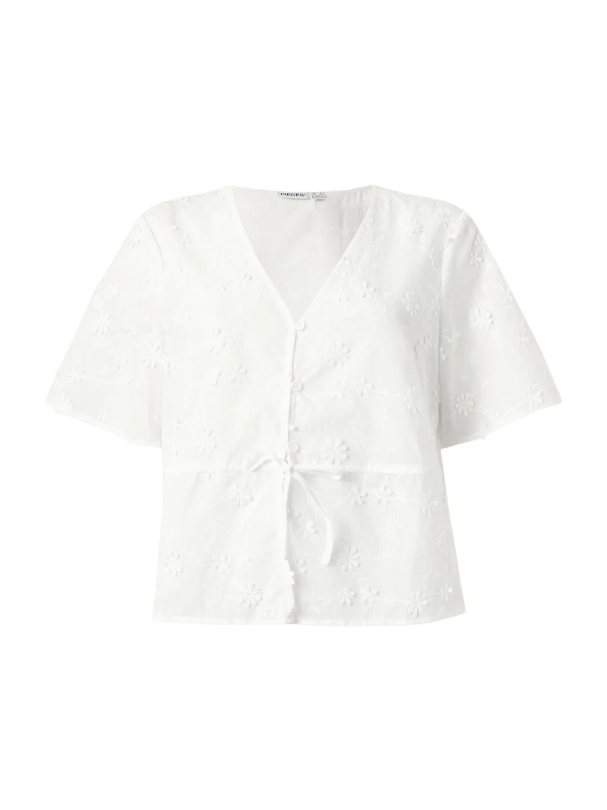 Blouse type: Klassieke blouse; Design: Gevoerde zoom/rand, Knop placket; Type sluiting: Knoopsluiting; Motief: Effen; Kraag: Zonder kraag; Details: Borduursels; Extra's: Lichte stof, Met textuur; Pasvorm: Losse pasvorm; Armlengte: Halve mouw; Lengte: Normale lengte