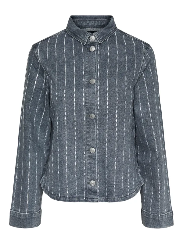 Blouse type: Klassieke blouse; Design: Gevoerde zoom/rand, Knop placket, Ronde zoom; Type sluiting: Knoopsluiting; Materiaal: Denim; Motief: Krijtstrepen; Kraag: Kentkraag; Details: Sierstenen; Extra's: Applicaties; Pasvorm: Normale pasvorm; Armlengte: Lange mouw; Lengte: Normale lengte