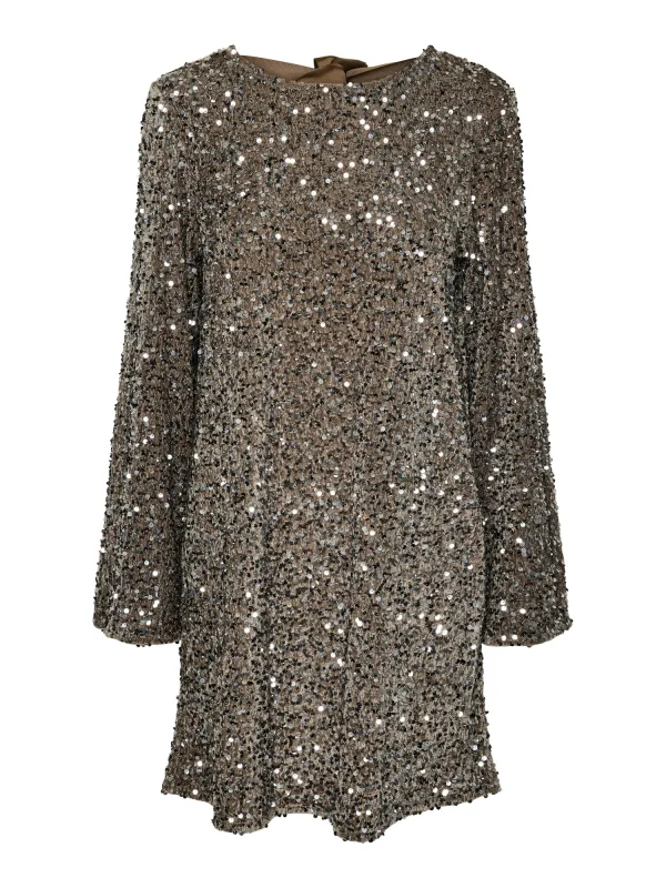 Cocktailjurk van Pieces;Model 'Kam';Look: glanzend, effen ;Pasvorm: nauwsluitend;Lengte: Mini;Hals: V-hals ;Applicatie: Met pailletten;Details: Band met strikken;Mouwvorm: lange mouwen ;Rugdecolleté: V-hals;Zoom: recht