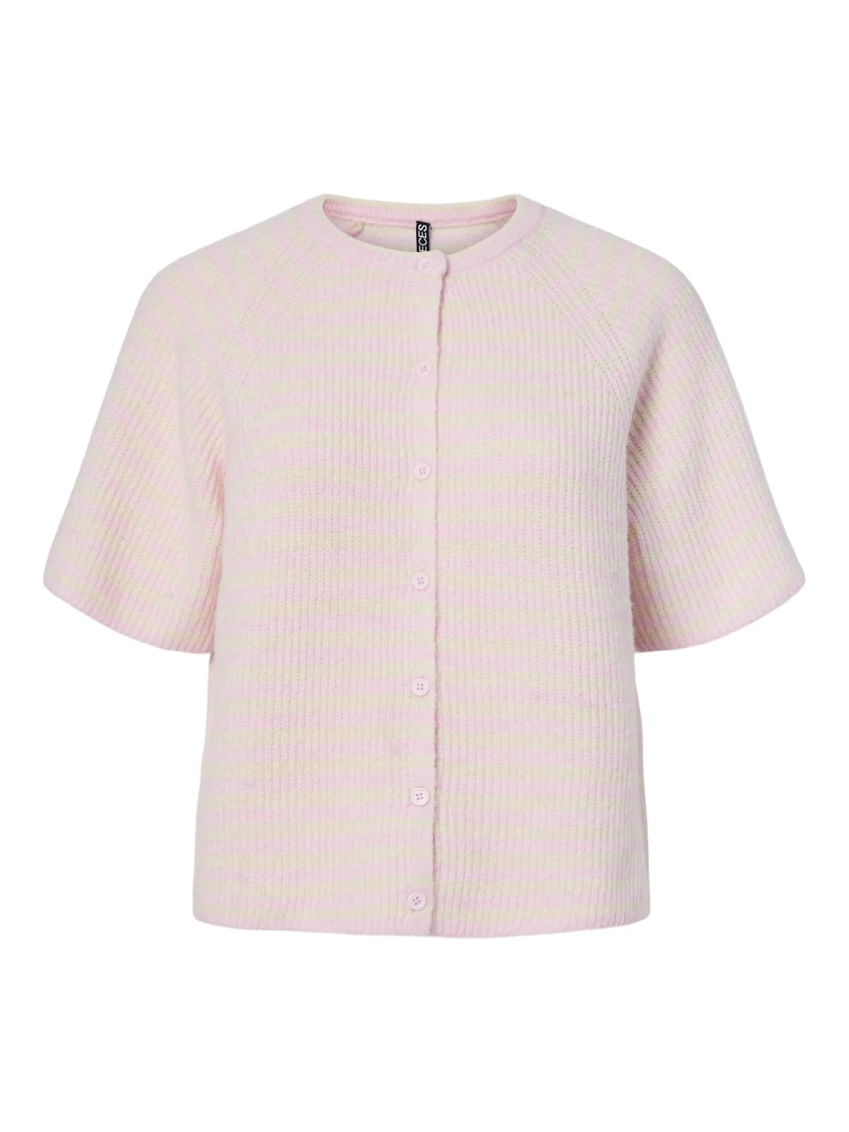 Dames gebreid jack van Pieces;Model 'Malou';look: meerkleurig;Pasvorm: regular fit;Sluiting: enkele knoopsluiting;Motief: gestreept;hals: ronde hals;mouwvorm: korte mouw, raglanmouwen;materiaalverwerking: ribtricot