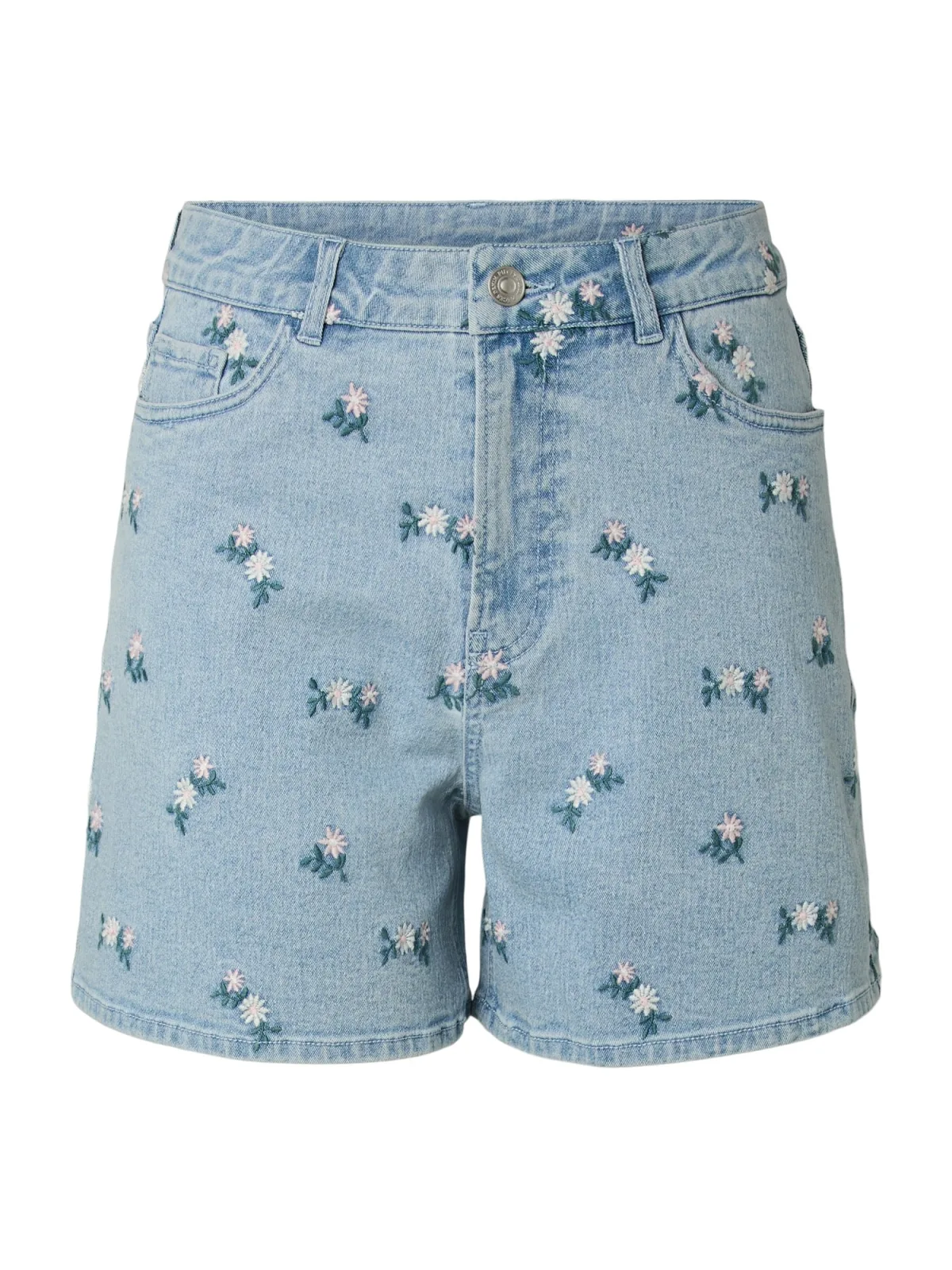 Design: Gevoerde zoom/rand, Ritssluiting, 5-pocket-style; Type sluiting: Ritssluiting; Materiaal: Denim; Motief: Bloemenprint; Details: Borduursels; Extra's: Applicaties, Contrasterende naden, Gewassen effect; Wassing: Light washed; Lengte: Kort/mini; Pasvorm: Regular; Taillehoogte: High waist