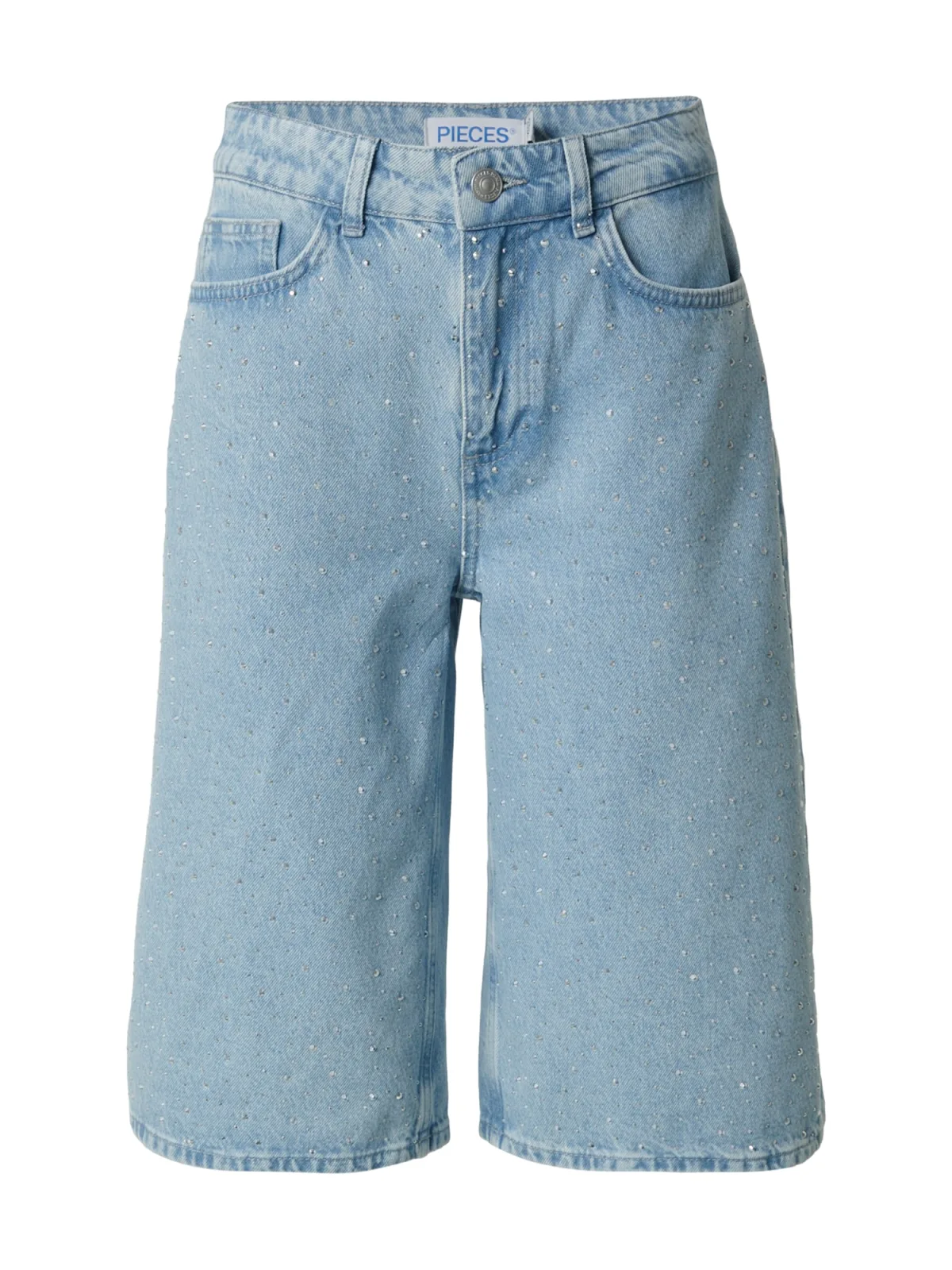 Design: Ritssluiting, 5-pocket-style; Type sluiting: Ritssluiting; Materiaal: Denim; Details: Sierstenen; Extra's: Glitterend, All-over patroon, Applicaties, Gewassen effect, Riemlussen; Wassing: Light washed; Lengte: Knielengte; Pasvorm: Loosefit; Taillehoogte: Mid waist