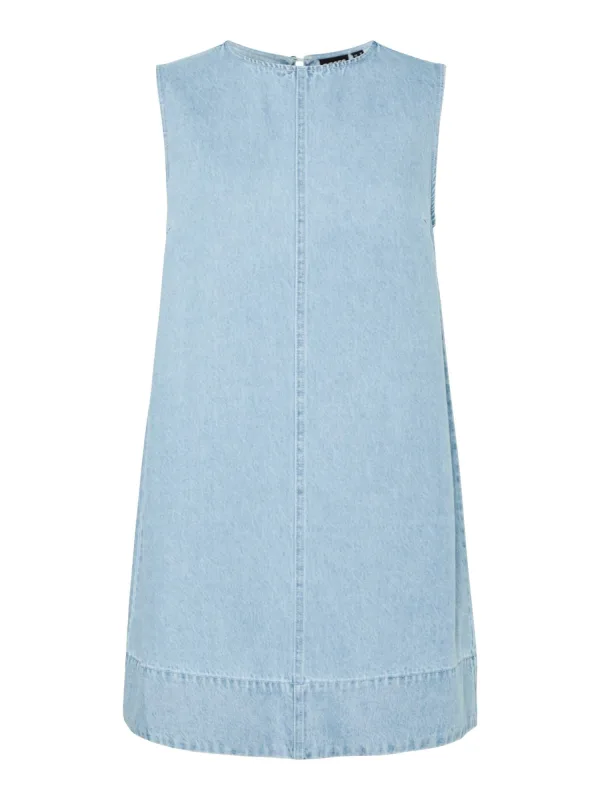 Dames denimjurk van Pieces;Model 'Flora';look: denim;Lengte: mini;Hals: ronde hals;Sluiting: oogje en knoop;mouwvorm: zonder mouwen;Materiaal: puur katoen