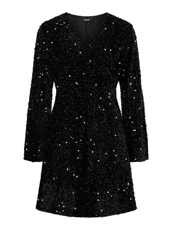 Jurk met pailletten van Pieces;Model 'Kam';Look: glanzend, effen;Pasvorm: getailleerd;Lengte: Mini ;Hals: V-hals;Applicatie: Pailletten;Mouwvorm: lange mouwen;Zoom: recht;Materiaalverwerking: Fluweel