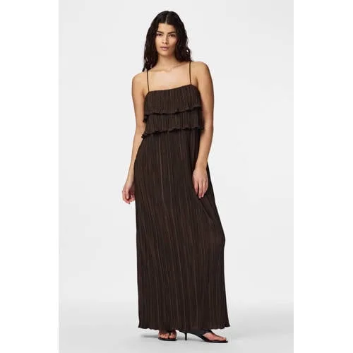 PIECES maxi jurk met plissé en ruches donkerbruin