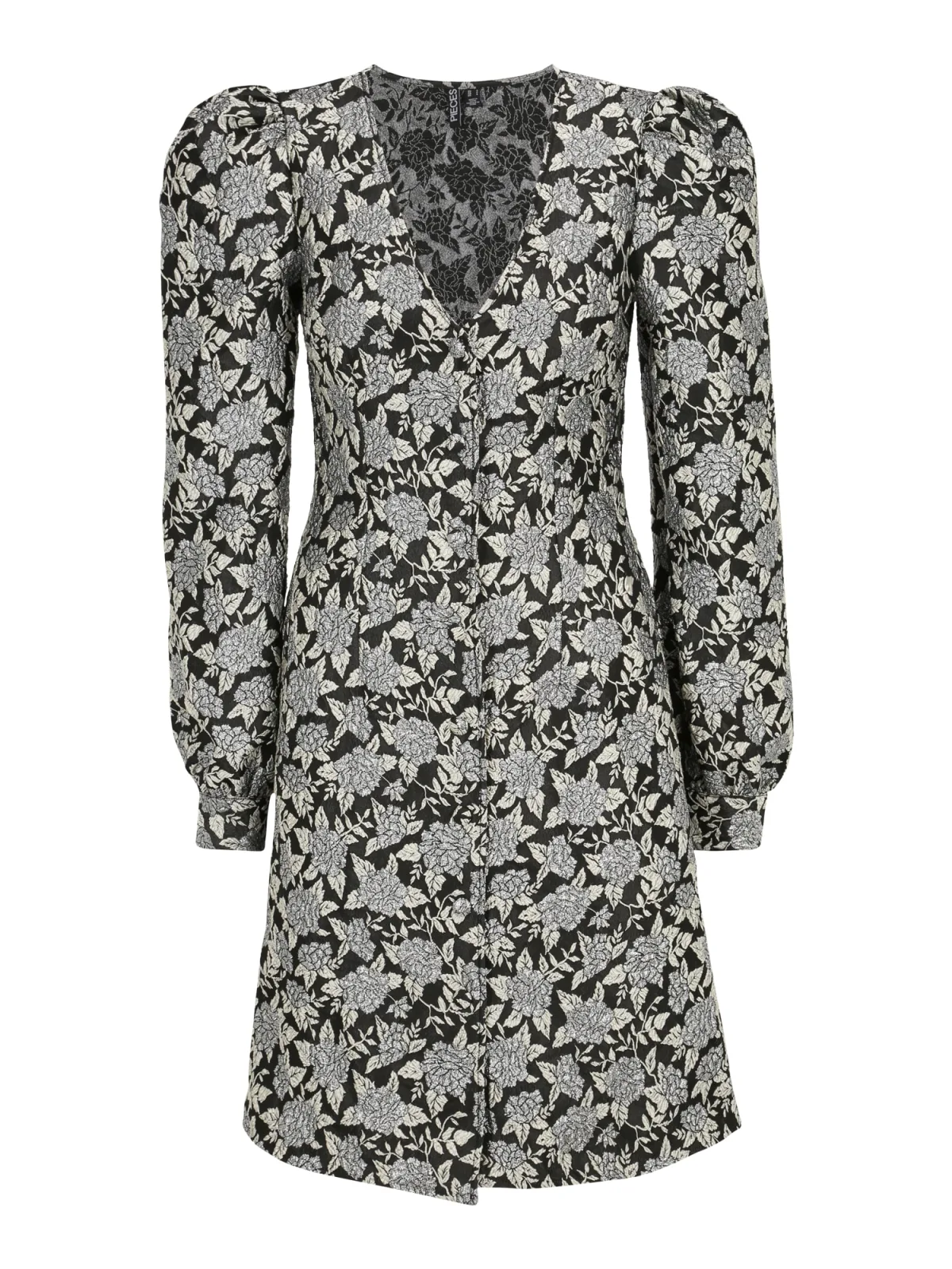 Design: Gevoerde zoom/rand, Pofmouwen, Diepe snit/decolleté; Halstype: V-hals; Motief: Bloemenprint; Details: Gedrapeerd; Extra's: All-over patroon, Gladde stof; Lengte: Kort/mini; Pasvorm: Normale pasvorm; Armlengte: Lange mouw