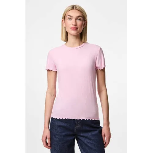 De PIECES PCNICCA dames top heeft een ronde hals en korte mouwen. Gemaakt van viscose met polyester en elastaan. De ribgebreide stof en ruches geven de top een speelse uitstraling. Zakken en sluiting ontbreken.
