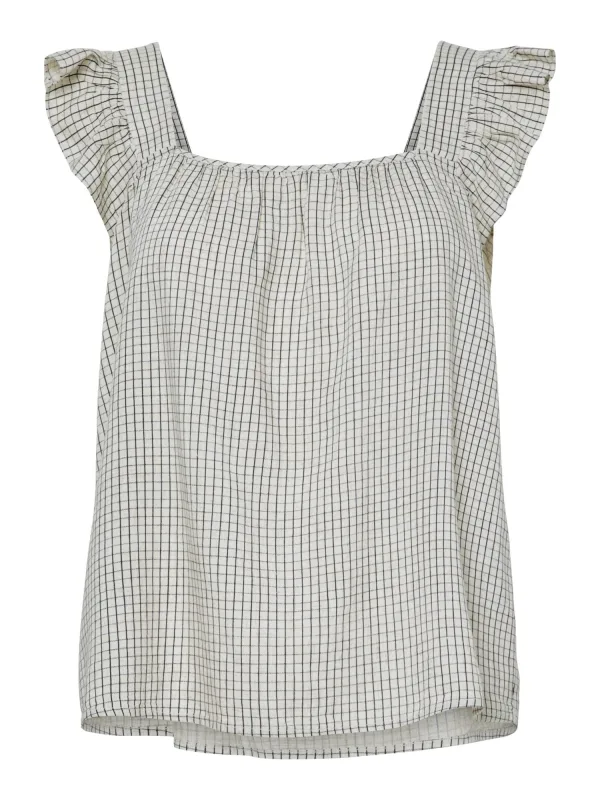 Blouse type: Blouseshirt; Design: Gevoerde zoom/rand; Materiaal: Viscose; Halstype: Boothals; Motief: Geruit; Kraag: Zonder kraag; Soort bandjes: Normale bandjes; Details: Ruches, Gedrapeerd; Extra's: All-over patroon; Pasvorm: Normale pasvorm; Armlengte: Mouwloos; Lengte: Normale lengte