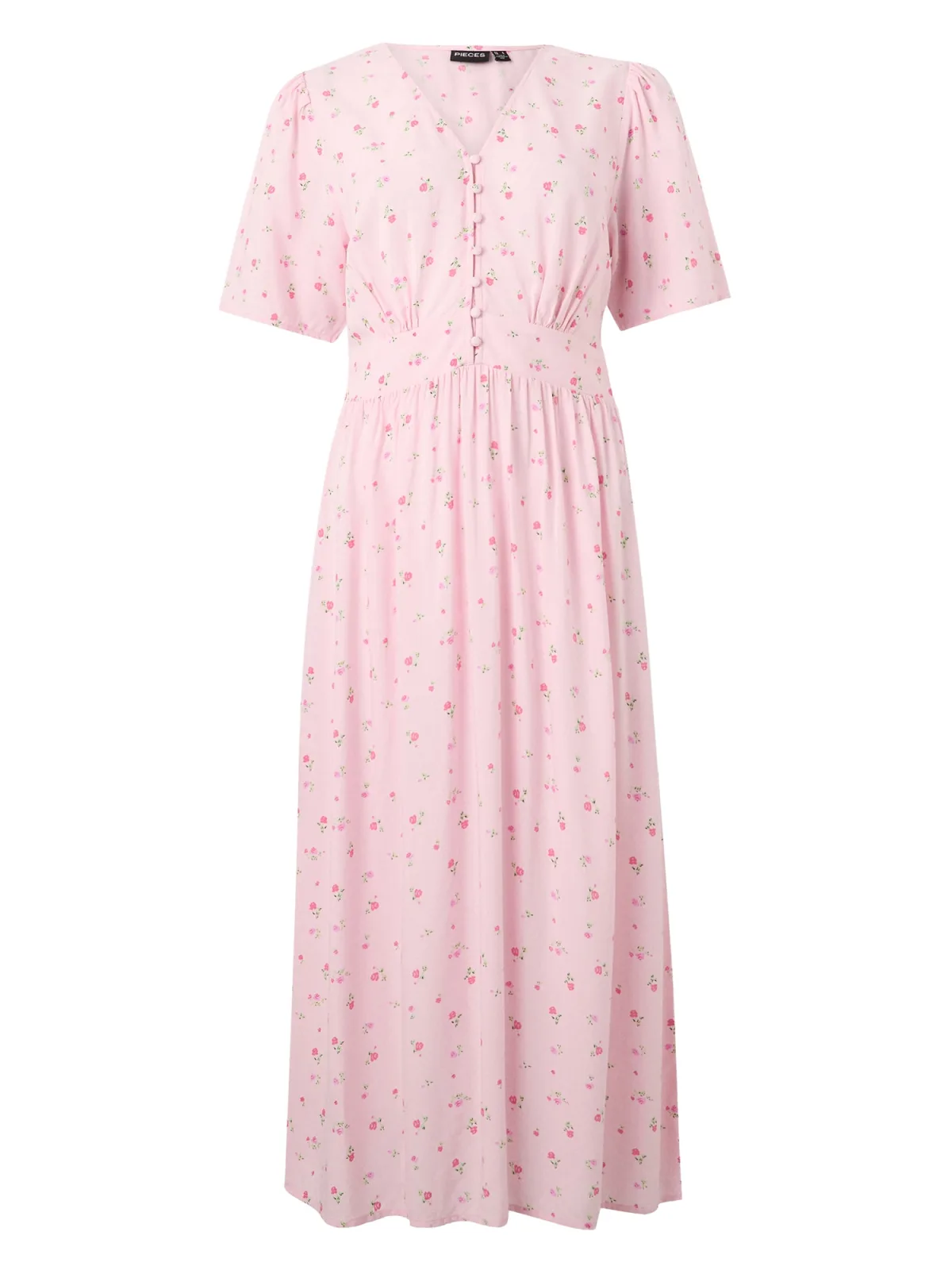 dames midi-jurk van Pieces;Model 'Tala';look: all-over motief;pasvorm/model: A-lijn;Lengte: midi;hals: V-hals;Details: elastiek;sluiting: korte knoopsluiting;mouwvorm: korte mouw;Zoom: recht;Materiaal: zuivere viscose