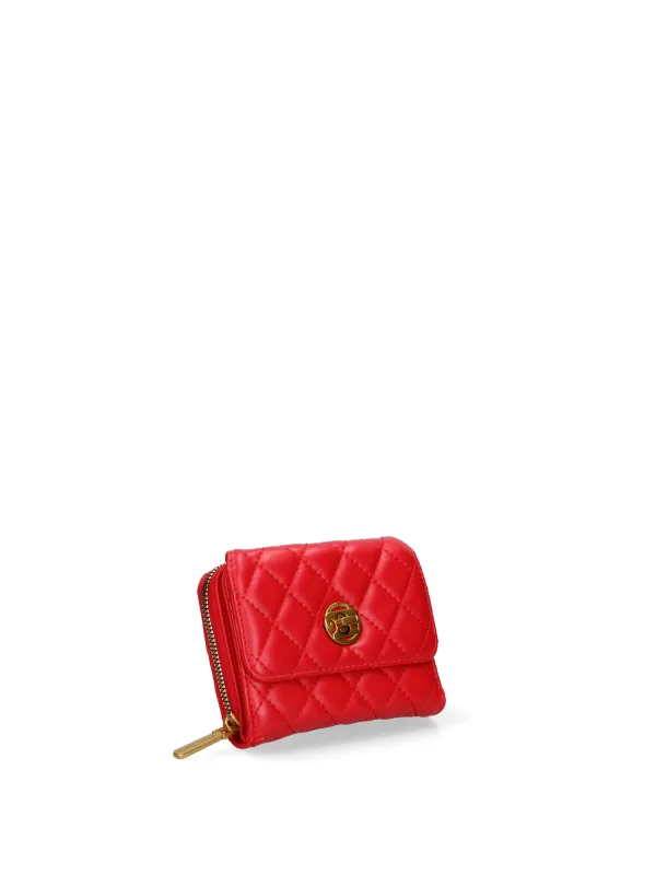 Damesportemonnee met draaisluiting. kaarthouder, bankbiljethouder en munthouder binnenzakken. één achterkant met externe zakken met ritssluiting. ontbrekende schouderband. ontbrekend handvat. een binnencompartiment. extern materiaal. 100% polyester binnenkant. Afmetingen: 13x10x4 cm. Modeproduct