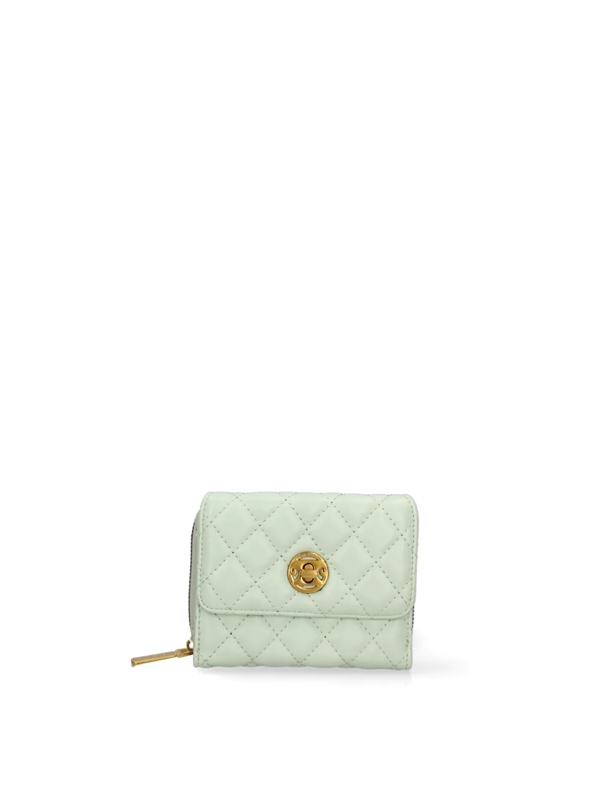 Damesportemonnee met draaisluiting. kaarthouder, bankbiljethouder en munthouder binnenzakken. één achterkant met externe zakken met ritssluiting. ontbrekende schouderband. ontbrekend handvat. een binnencompartiment. extern materiaal. 100% polyester binnenkant. Afmetingen: 13x10x4 cm. Modeproduct