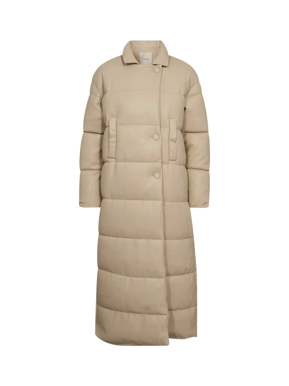 Type mantel: Gewatteerde jas; Design: Zakken aan de zijkant; Type sluiting: Knoopsluiting; Voering: Warm gevoerd; Materiaal: Imitatieleder; Motief: Effen; Extra's: Stiksels; Pasvorm: Normale pasvorm; Lengte: Lange pasvorm