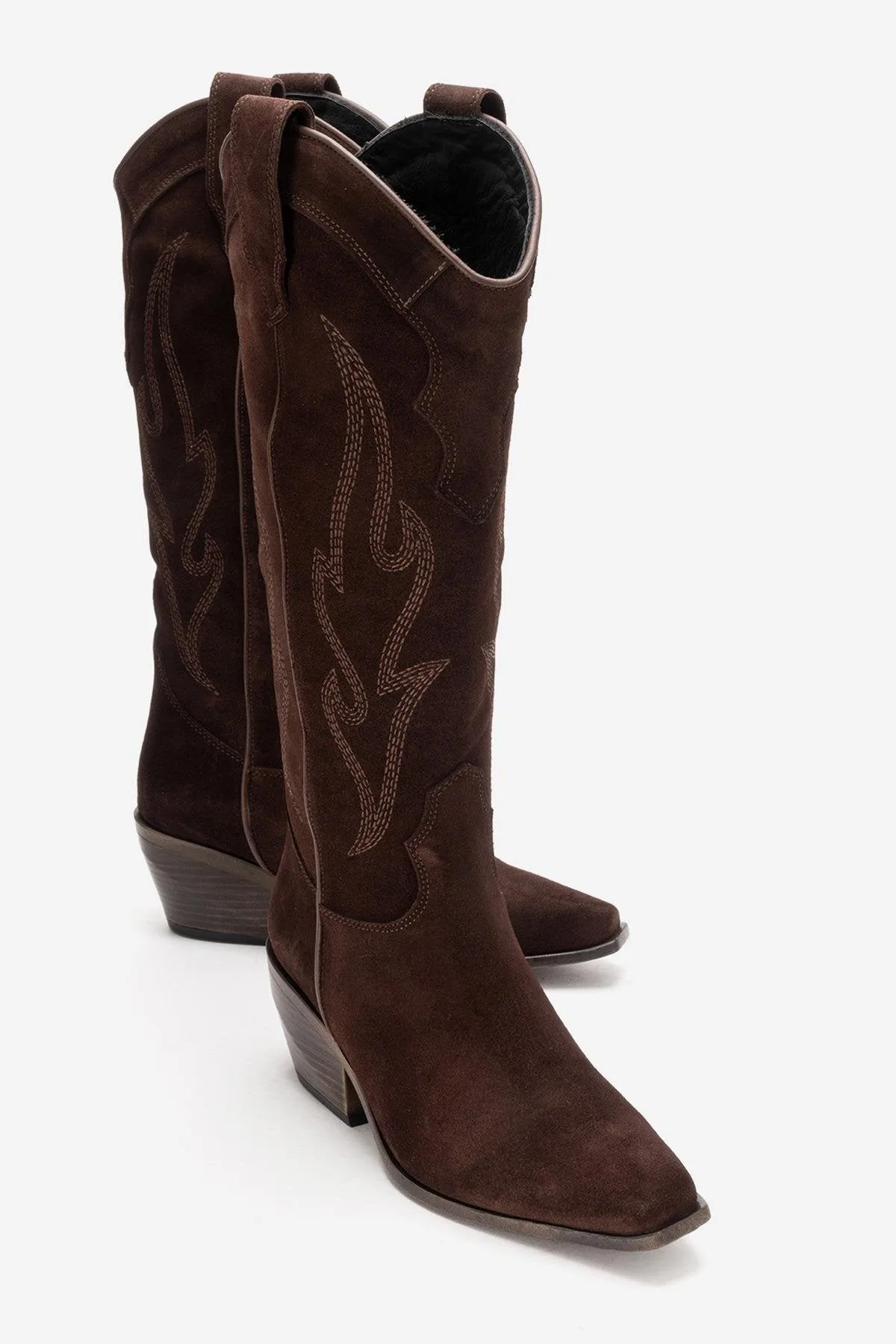 Een tijdloze suède western boot die zachte textuur combineert met een sculpturale vorm voor een opvallende stijl