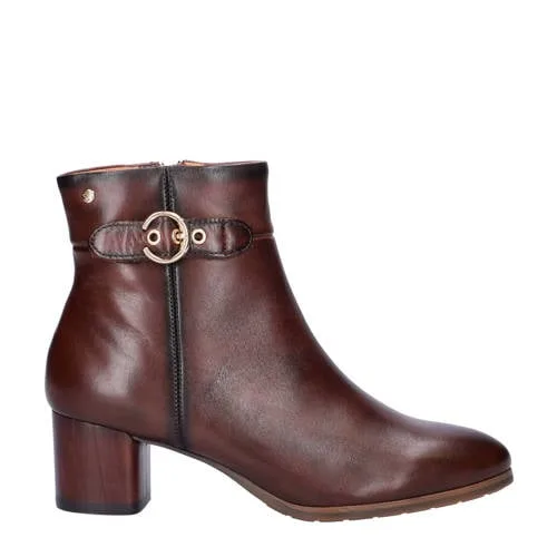 Deze Pikolinos Calafat enkellaars heeft een buitenkant van leer en een blokhak. De laars sluit met een rits, heeft een siergesp en een voering van textiel voor een fijne pasvorm.