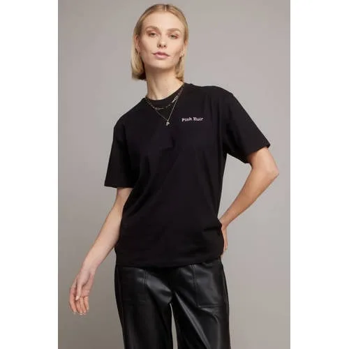 Creëer eenvoudig een dagelijkse look met het Pink Noir Shelah dames T-shirt. Dit zwarte T-shirt met roze accenten heeft een rechtvallende pasvorm en korte, rechte mouwen. De ronde hals geeft een rustige basis, terwijl de tekst backprint op de achterkant zorgt voor een opvallend detail zodra je je omdraait. Gemaakt van 100% katoen voelt de stof soepel en zacht aan op de huid, ideaal voor elke dag.Details die je elke dag aantrekt Rechtvallend model dat relaxed langs het lichaam valt Korte, rechte mouwen voor een luchtig geheel Ronde hals, makkelijk te combineren met verschillende stijlen Zwart/roze kleurcombinatie met tekst backprint op de rug Gemaakt van 100% katoen voor een zachte touch Onderdeel van de 'Daily' collectie, passend bij je dagelijkse garderobeAltijd goed te combinerenDit T-shirt draag je net zo makkelijk op een jeans als op een short of een comfortabele jogger. De zwart/roze kleur past goed bij denim, wit en grijs, waardoor je snel een complete outfit samenstelt. Geschikt voor een relaxte dag thuis, een dag op kantoor met een blazer erover of een casual look in het weekend.Pink Noir: dagelijkse mode met karakterPink Noir richt zich op eigentijdse damesmode met aandacht voor kleur, print en draagbare ontwerpen. De collecties sluiten aan op een druk dagelijks leven, met items die je makkelijk aantrekt en combineert. Zo voeg je met elk Pink Noir item iets herkenbaars en doordachts toe aan je kledingkast.Een T-shirt dat snel een vaste plek in je dagelijkse outfits krijgt.