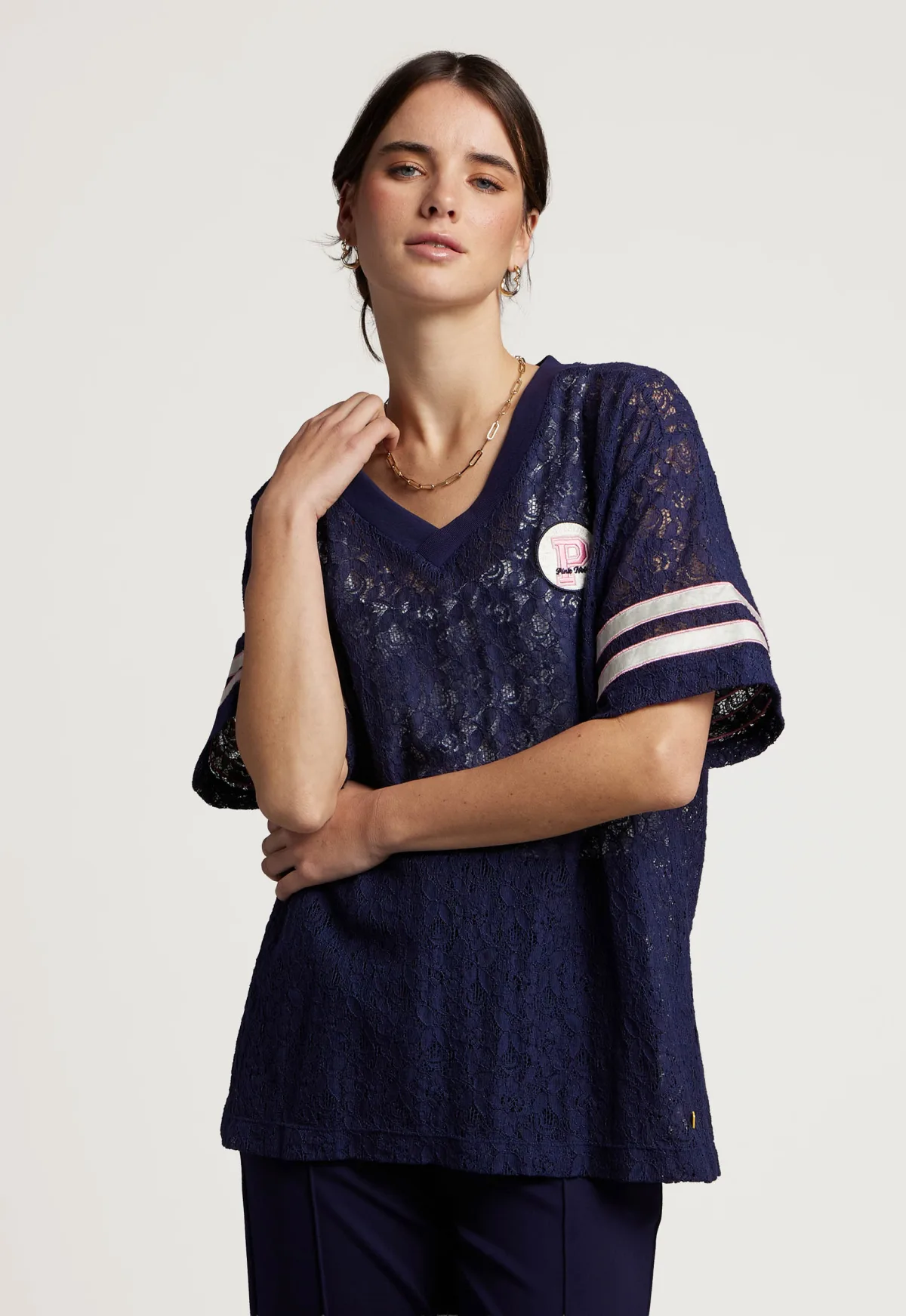 Dit is het PN22243193 Yoni T-shirt van het merk Pink Noir. Deze Yoni T-shirt heeft een oversized pasvorm en is geïnspireerd op een voetbalshirt. Het is gemaakt van een zachte katoenen stof met een lichtgewicht en ademende kantstructuur, aangevuld met nylon. Dit model valt op door de V-hals en de korte mouwen, en is voorzien van een groot 81 appliqué artwork op de rug, samen met het Pink Noir logo. De sportieve strepen op de mouwen en het patch achtige ontwerp geven het een authentieke varsity en voetbalshirt look.