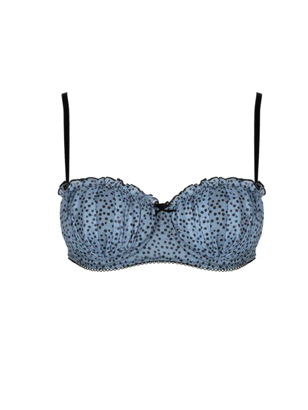 Balkonbed Met beugels Licht verstevigde cups Verstelbare sluiting op de rug Verstelbare bandjes Gestippeld Versierd met ruches bovenaan Met plooitjes op de cups Gemaakt van hoogwaardige stof