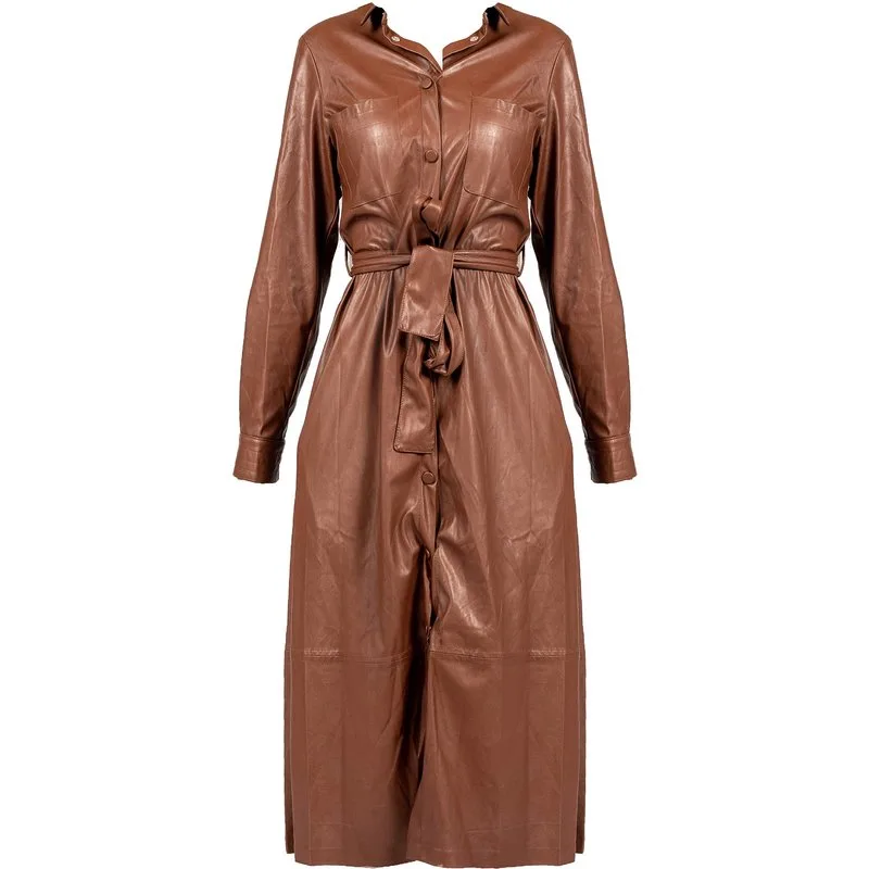 Passende pasvorm Midi-lengte, knielengte Sluit met drukknopen Met kraag Lange mouwen Manchetten met drukknopen Linkerzijde zak Twee zijzakken Met bijgevoegde riem Gemaakt van hoogwaardig kunstleer Geproduceerd in Italië