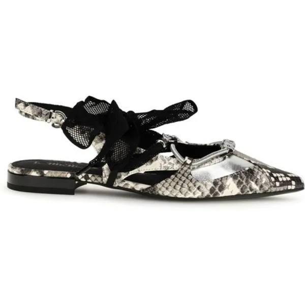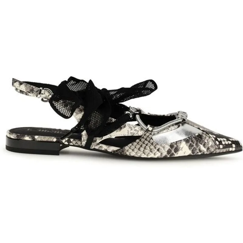 De python-print Gianira Ballerina's van Pinko combineren gedurfde stijl met ambachtelijke verfijning. Het model met een puntige neus, uitgevoerd in leer, is voorzien van een verstelbare gesp en een elastische inzet voor een comfortabele pasvorm. Metalen applicaties, kralen en zilveren details, samen met het logo en het Python patroon, verrijken de schoen met een onderscheidende en moderne uitstraling, terwijl de rubberen zool zorgt voor comfort en stabiliteit. Seizoen: SS26 Samenstelling: 100% Kalfsleer Bos Taurus