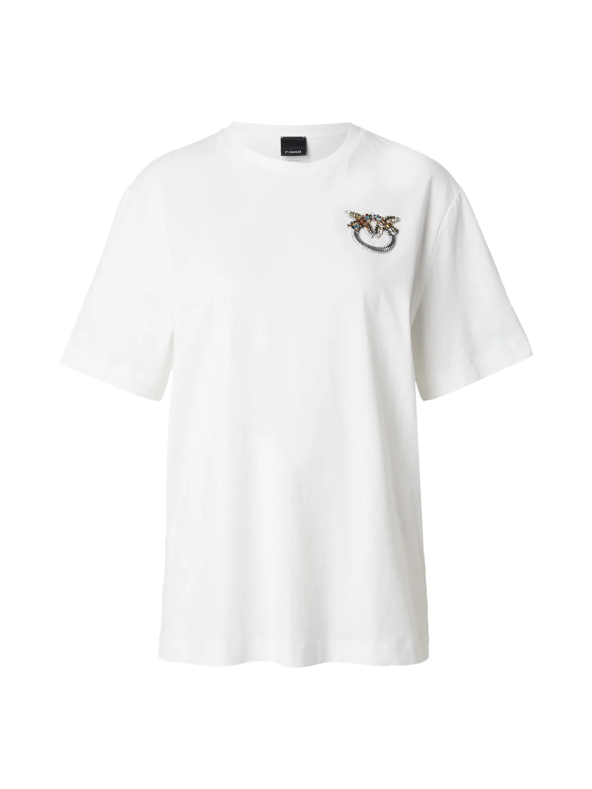 Het Strepitoso T-shirt van Pinko is een casual-chique artikel gemaakt van zachte, comfortabele katoen. Het geborduurde logo met rhinestones aan de voorkant voegt een vleugje glamour en verfijning toe, waardoor het perfect is voor wie op zoek is naar een elegante, maar informele look. De ronde hals en eenvoudige pasvorm maken het ontwerp compleet, waardoor dit T-shirt veelzijdig is voor elke gelegenheid. Ideaal om een vleugje glamour aan je dagelijkse outfit toe te voegen. Seizoen: SS26 Pasvorm: Regular Samenstelling: 100% Katoen