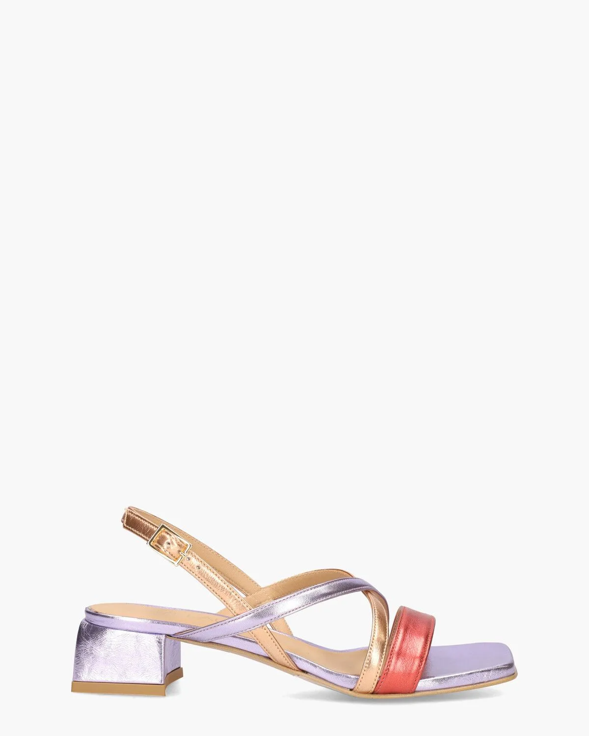 Prachtige sandalen voor dames model 3000 uit de collectie van Di Lauro. Dit carrémodel heeft een bovenwerk van leer in verschillende metallictinten zoals lila, rood en roségoud. De binnenkant en het voetbed zijn ook in leer uitgevoerd. De bijzondere blokhak is circa 4 cm hoog. Het riempje bij de enkel is verstelbaar. Kleur: