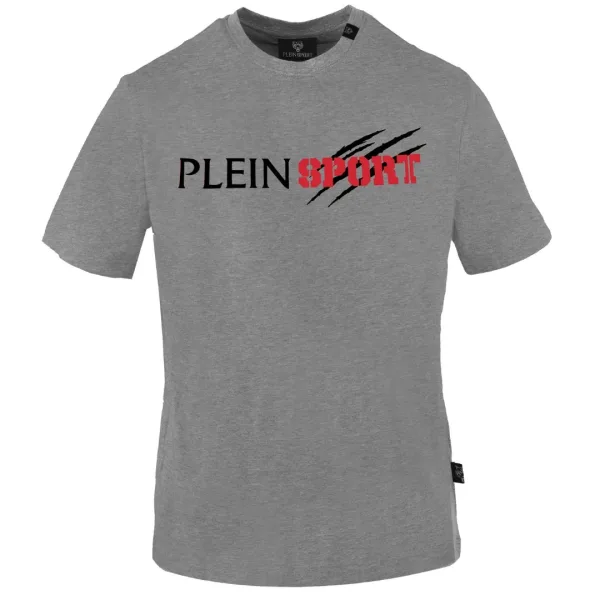 Plein Sport grijs T-shirt, 100% katoen, Plein Sport merklogo, korte mouw, ronde hals, Plein merkbadges, gemaakt in Bangladesh, grijs T-shirt