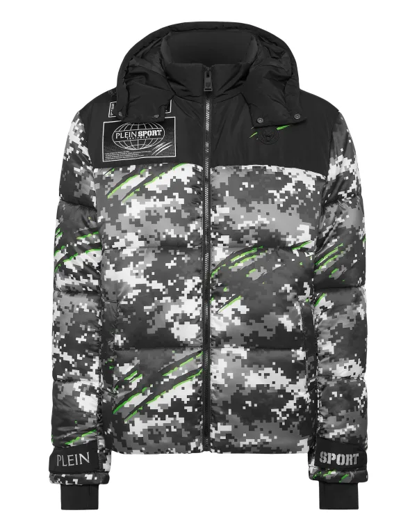 Check out this padded and insulating hooded jacket suited for after-training. Warm, light and optimal protection. Padded and quilted nylon Camouflage pattern Removable hood Zip fastener on front Slit pockets Silicon patches sewn at chest Elasticated hems Inner lining Down insulation