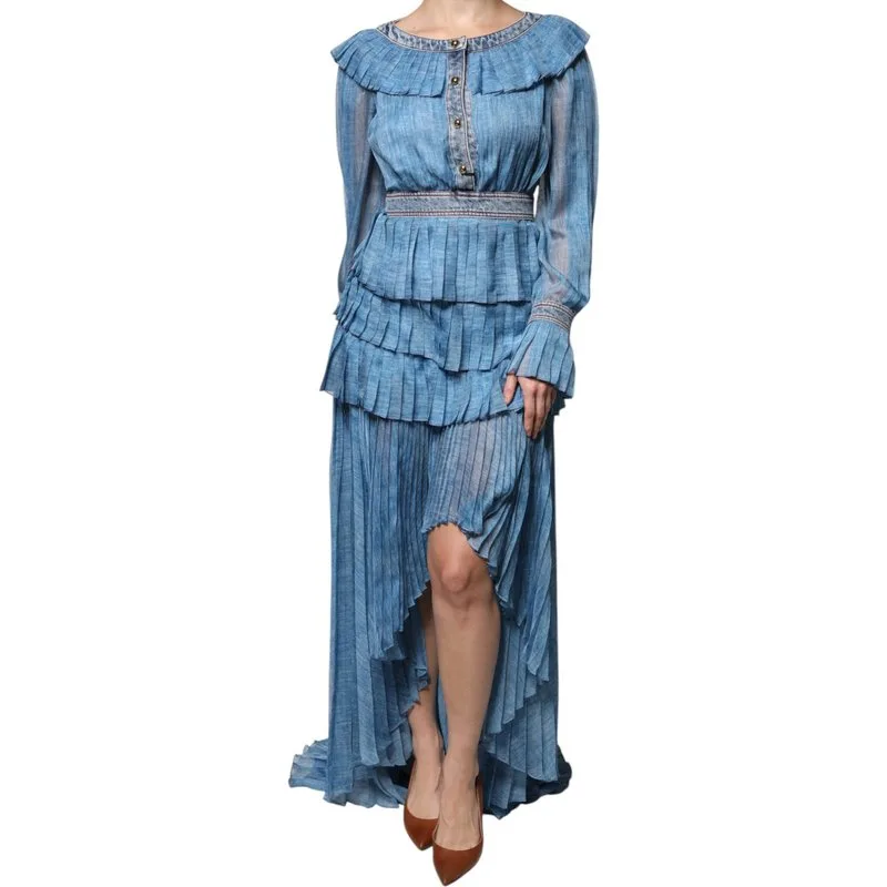 Omarm moeiteloze stijl en straal tijdloze charme uit. Deze denim jurk biedt ongeëvenaarde veelzijdigheid en gaat moeiteloos van dag naar nacht. De prachtig geplooide rok voegt een vleugje speelse elegantie toe, terwijl de hoge-lage zoom een flatterende silhoutte creëert. Lange mouwen bieden bedekking en verfijning. Ervaar de perfecte mix van comfort en stijl. Draag het met hakken voor een chique look of houd het casual met sandalen. Een essentiële aanvulling voor elke gelegenheid.