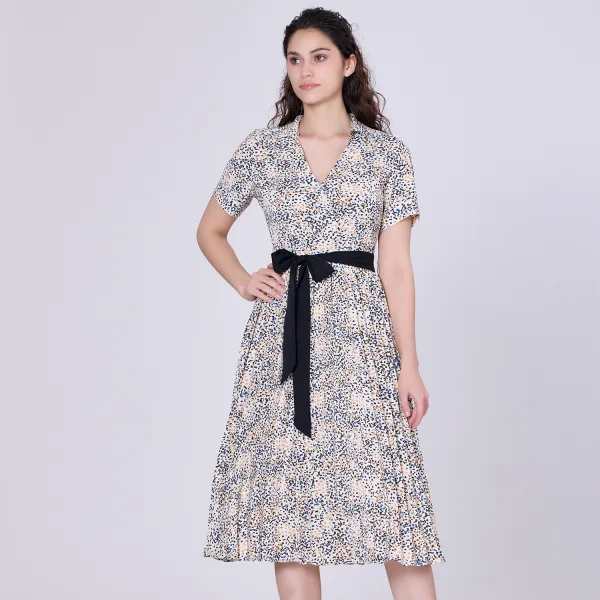 Plooien gedrukte thee -jurk en toegevoegde riem