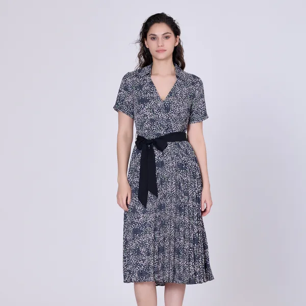 Plooien gedrukte thee -jurk en toegevoegde riem