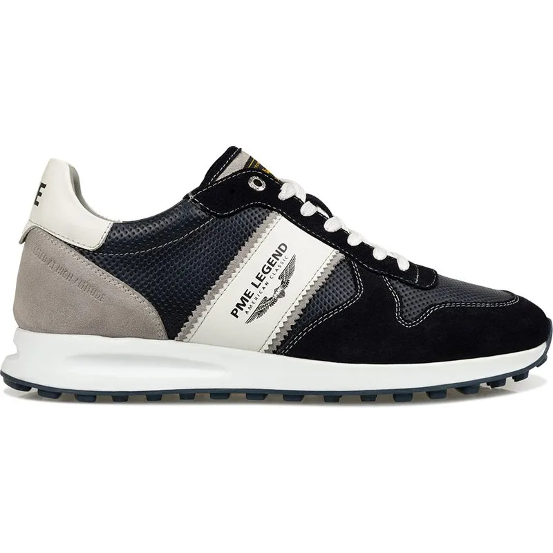 PME Legend sneakers voor hem. De sneakers zijn gemaakt van hoogwaardig leer en suede. De sneaker heeft een uitneembare EVA binnenzool, wat zorgt voor een lekkere demping. Merk: PME LegendModelnaam: FlightubeCategorie: heren sneakersMaterialen: leer/suedeKleur: blauw, wit, grijs