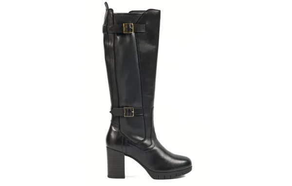 De Nitika-kniehoge laarzen combineren chic stijl met functionaliteit. Gemaakt van soepel zwart leer, zijn ze afgewerkt met gouden gespen voor een vleugje elegantie. Met een rits aan de binnenkant en elastische panelen bieden deze laarzen gemakkelijk aan- en uittrekken. De platformzool en blokhakken van 85 mm bieden zowel hoogte als stabiliteit, waardoor ze perfect zijn voor de hele dag. Met premium leer, logo-accents en een strakke vormgeving zijn de Nitika-laarzen een onmisbare aanvulling op je garderobe. - Soepel leren bovenwerk - Platformzool - Rits aan de binnenzijde van het been - Gouden gespen met Pod-branding - Hoogte van de blokhak van ca. 85 mm