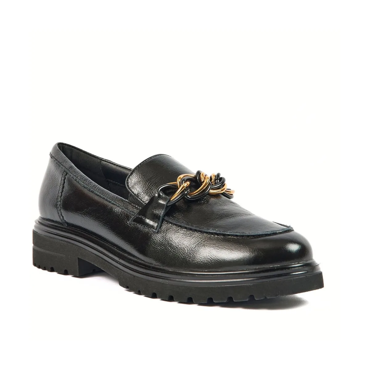 De TATE is een nieuwe kijk op een klassieke loafer, met een gouden metalen kettingsluiting en een dikke zool. Ontworpen in eersteklas zwart leer, passen deze schoenen goed bij zowel broeken als jurken.