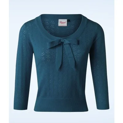 Deze 50s Pointelle Bow Top in Steal Blue is er eentje om verliefd op te worden! Nee, dit is geen illusie… deze prachtige top is een droom die uitkomt! De top heeft een mooie ronde halslijn met een speelse strik en 3/4 mouwtjes, cute! Uitgevoerd in een heerlijk soepele, stretchy, fijngebreide, staalblauwe viscosemix met een klassiek opengewerkt patroon. Een veelzijdige top die niet mag ontbreken in de kast van een echte vintage lady! * Ronde halslijn * Vaste strik * 3/4 mouwtjes * Stretchy ribboorden * Lang genoeg om op een normale heupbroek te dragen