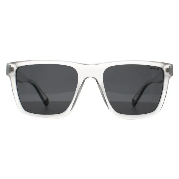 Polaroid Square Mens Crystal Grey Polarized PLD 6176/S zonnebril is een rechthoekige stijl gemaakt van stevig acetaat met een plat montuur met Polaroid logo op de poten.